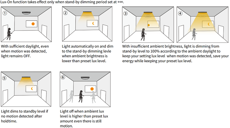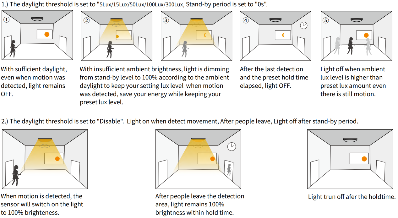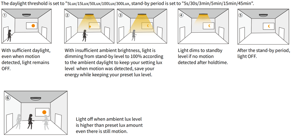 ডুয়াল-পিডি প্রযুক্তির জন্য ধন্যবাদ, MC004-S02R সেন্সর প্রাকৃতিক আলো এবং কৃত্রিম LED আলোর মধ্যে পার্থক্য বলতে পারে। পরিবেষ্টিত আলো সেটিং মানের থেকে কম হলে সেন্সর আপনার আলোর ফিক্সচার চালু করবে, এমনকি কোনো গতি শনাক্ত করা হয় না। যখন পরিবেষ্টিত আলো সেটিং মান পর্যন্ত থাকে, তখনও গতি থাকলেও সেন্সর আলোর ফিক্সচার বন্ধ করে দেবে।