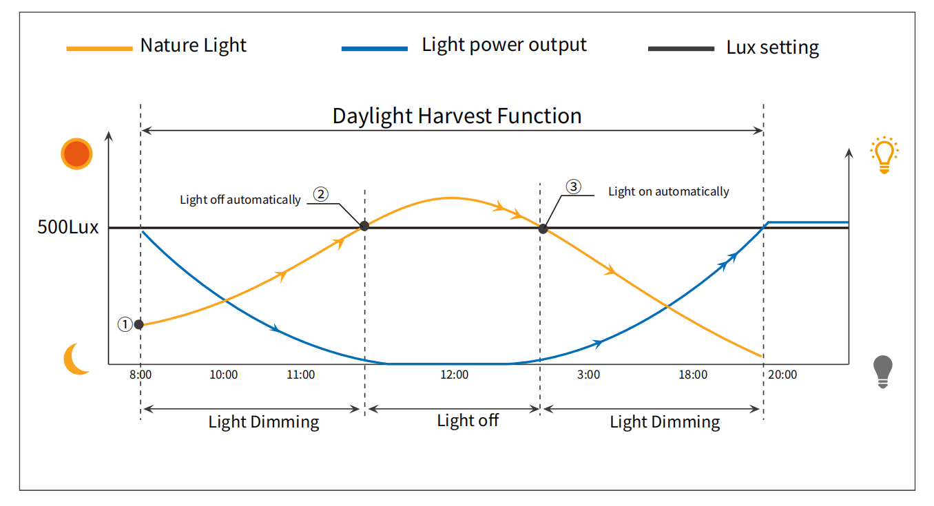 1. মোশন ডিটেকশন + ডেলাইট হার্ভেস্ট + লাক্স অন/অফ ফাংশন